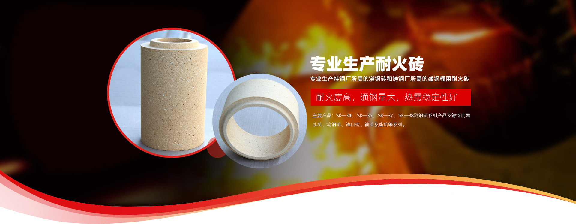 主要產品:SK—34、 SK—36、 SK—37、 SK—38澆鋼磚系列產品及鑄鋼用塞頭磚、鑄口磚、袖磚及座磚等系列產品